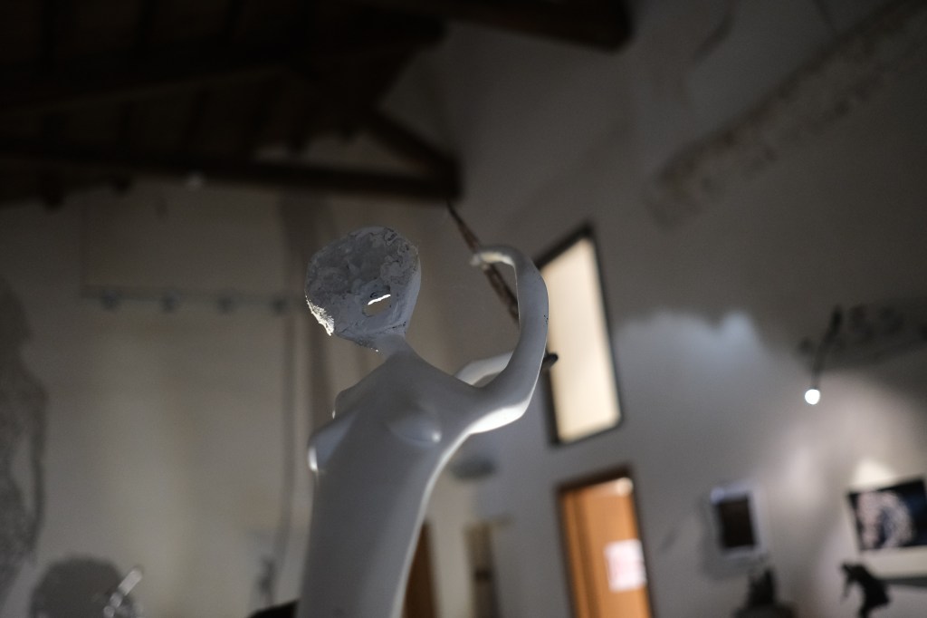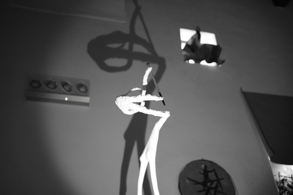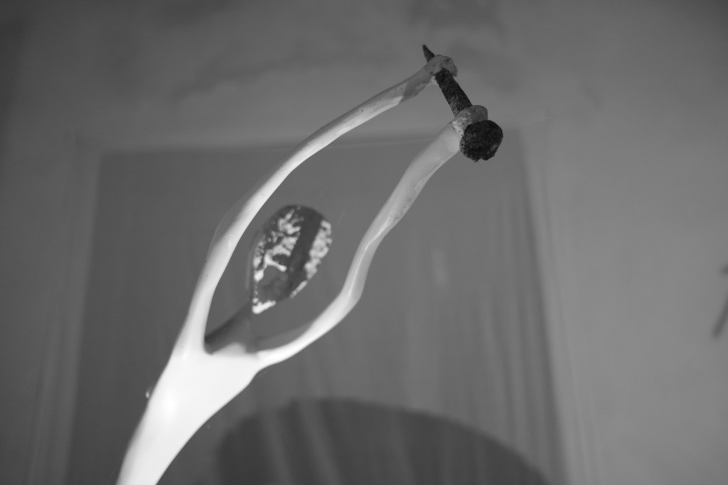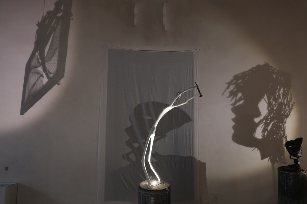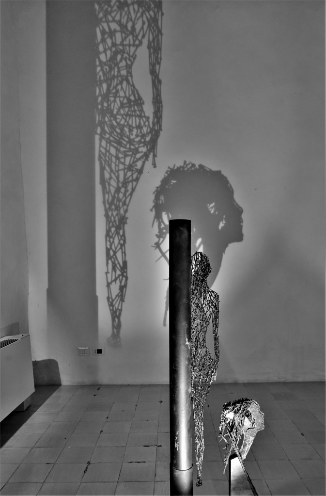 Mi sono chiesto se nella testa di Enzo nascano prima le ombre o le sculture che generano le stesse, mi sono chiesto anche se questa perfezione e armonia di forme riflesse sia arrivata casualmente o cercata affannosamente… perché in fondo nelle opere di Enzo ho visto tracciare la perfetta rappresentazione di sé stesso, e così come le sue sofferenze e le sue ossessioni sono riflessi nelle sue opere d’arte, così i suoi chiodi e le sue sculture riflettono ombre dalle forme anche inaspettate (opere d’arte terze). Quindi Enzo dalla sofferenza crea la bellezza della sua scultura, la scultura stessa – come se avesse vita propria – crea dalla propria sofferenza un’altra opera d’arte riflettendo la bellezza di un’ombra dalle forme perfette e armoniose… tanto che dopo un po’ ti chiedi quale sia la vera opera d’arte: la scultura o la sua ombra?! In realtà entrambe ti trasmetteranno emozioni e suggestioni diverse, e se nella scultura si avverte il tormento, nella sua ombra si ritroverà una sorta di serenità perduta.