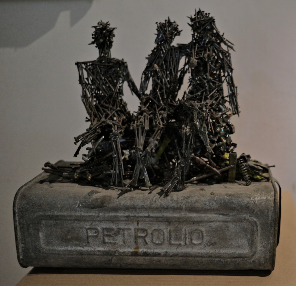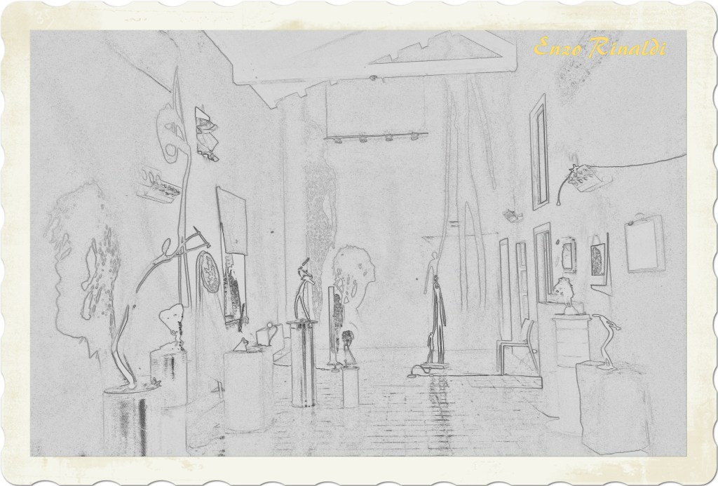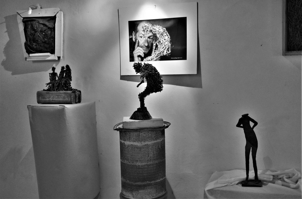 Io non so se ho avuto questa capacità, in fondo tutto quello che ho scritto su Enzo Rinaldi è “frutto” del dubbio, so solo che avendo approfondito la conoscenza del suo percorso di vita, i suoi drammi e le sue ossessioni, le sue tragedie e i suoi sollievi, trovarmi nella stanza che ospita le sue opere – tra chiodi e ombre, sculture e suggestioni – è stato quasi un impatto scioccante: un’emozione così forte da sedersi in un angolo della stanza a piangere come un bambino. Enzo si capisce che è persona e sensibilità unica, avvertita da me anche in parte come l’espressione della complessità di questo territorio e della vita “diversa” che qui vi scorre da sempre. Spero che Enzo non percepisca come irrispettoso questa mia voglia di trasmettere la sua storia… ma mi auguro capisca che anche la mia non è stata una scelta, ma piuttosto un bisogno interiore di raccontare in qualche modo quello che mi ha trasmesso la sua conoscenza seppur indiretta – o forse quella più diretta perché avvenuta attraverso le sue opere –; perché ancora una volta il mondo di quest’uomo e artista – e ciò che è riuscito a creare – l’ho percepite come l’ennesima alta rappresentazione di una Sicilia intensa, sorprendente e complicata… quella Sicilia che cerco disperatamente come uno scappato di casa, quella Sicilia fatta di persone e realtà uniche, così come uniche sono le vite di Enzo Rinaldi e delle pietre di Petralia Soprana, opere d’arte che solo in Sicilia potevano manifestarsi…