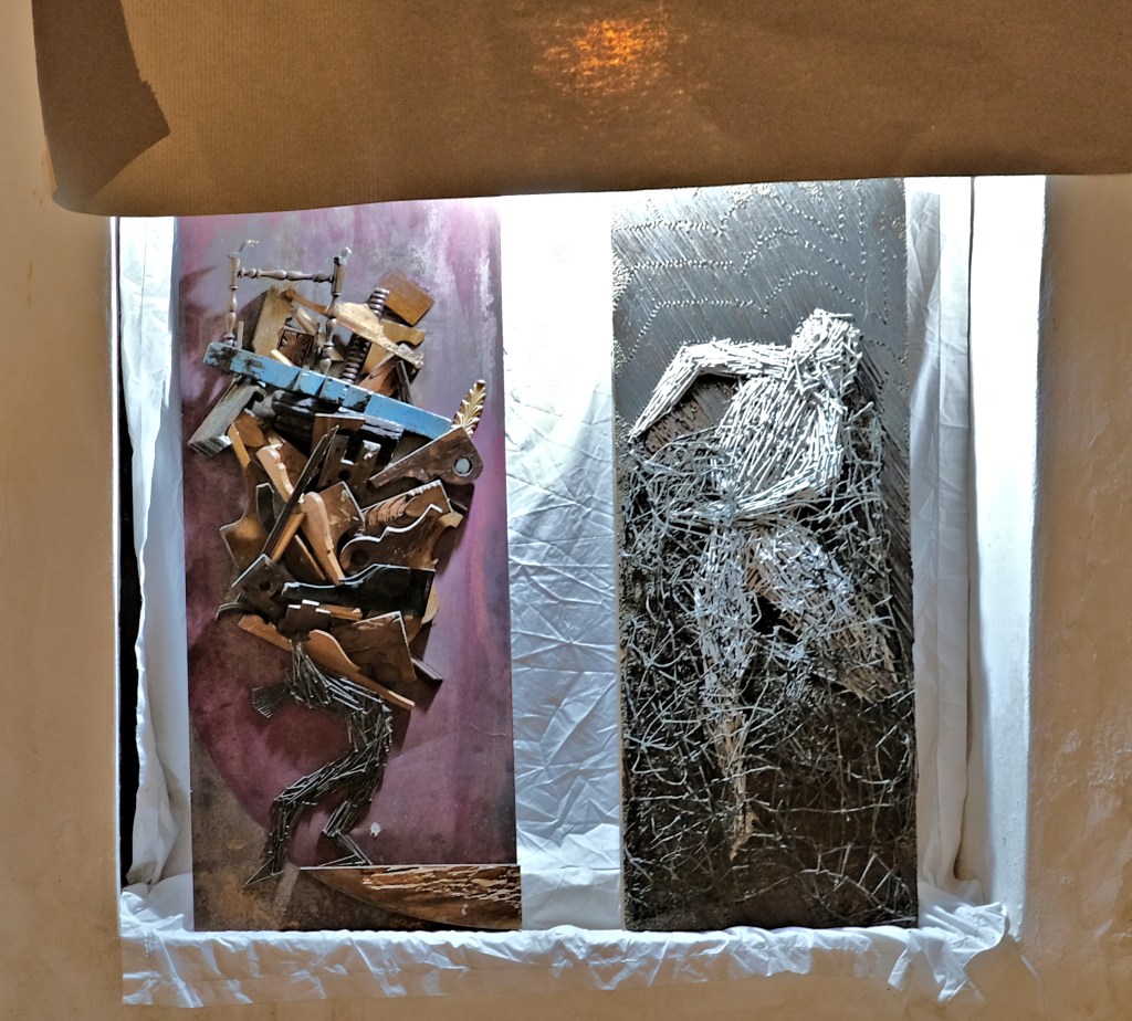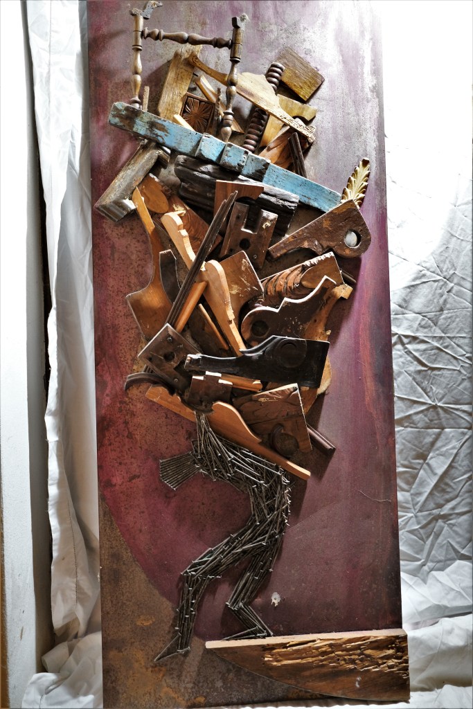 “Il passato è troppo presente, per questo non ho futuro”, con questa frase Enzo Rinaldi mi ha fatto capire che la sua forza espressiva nasce tutta da un vissuto tormentato. Ancora una volta (così come per Fabio Pilato, seppur per motivi diversi) ci troviamo di fronte a un caso in cui la sofferenza diviene opera d’arte. “Chiodo fisso”, espressione della necessità di comunicare i propri tormenti e le proprie ossessioni, ma anche “chiodo scaccia chiodo”, in questo caso simboleggiato da un posare lento e silenzioso di chiodo sopra chiodo, uno dopo l’altro, esercizio zen eseguito da Enzo Rinaldi come fosse una terapia per superare le proprie sofferenze. Tutto questo poteva avvenire solo nella frazione di Raffo di Petralia Soprana, in quelle Madonie affascinanti e silenziose, dove la solitudine spesso diventa la migliore compagna dei propri tormenti.
