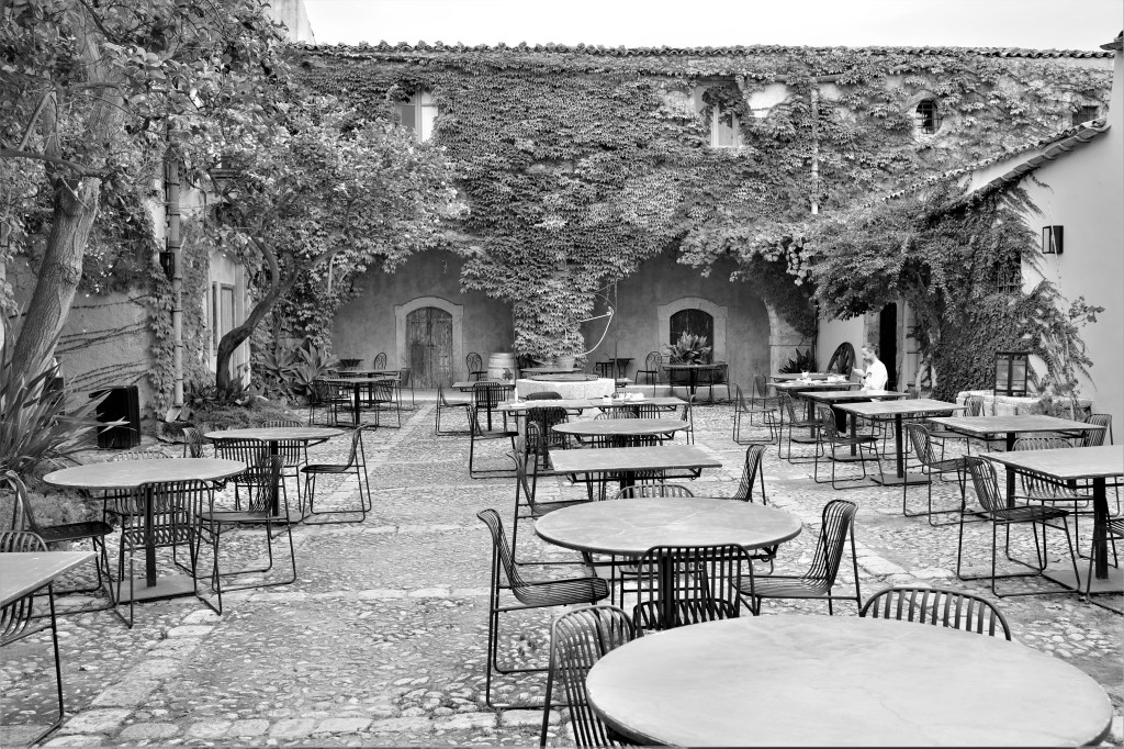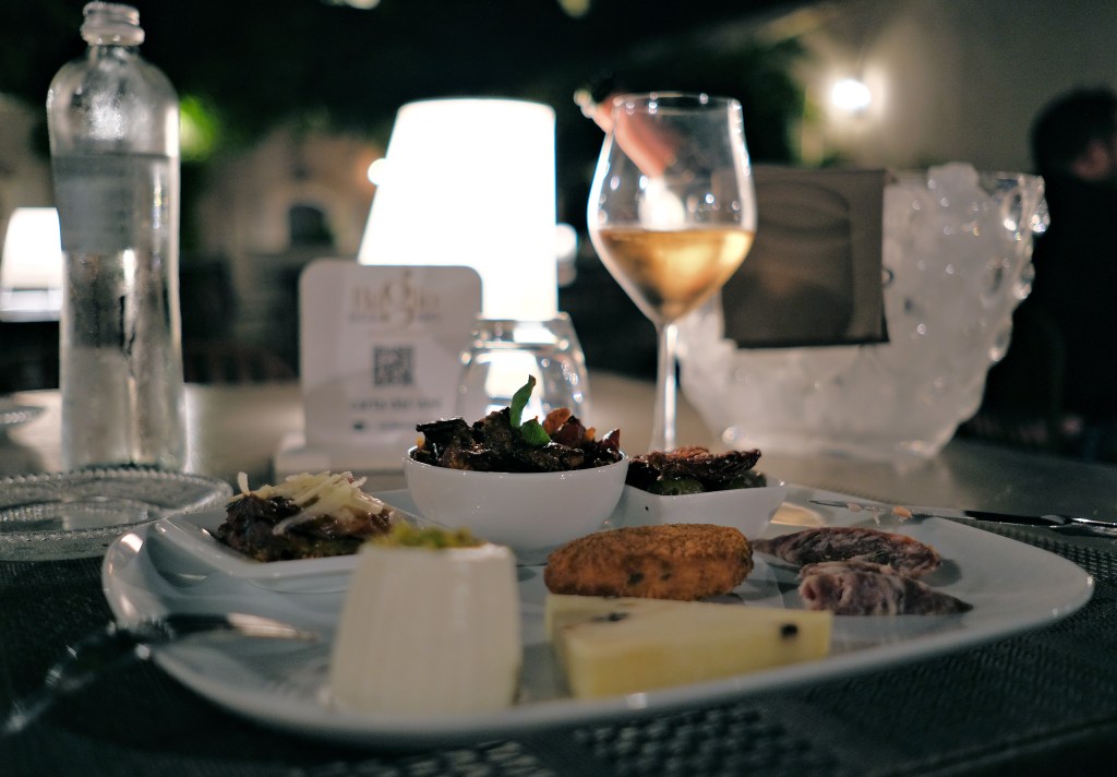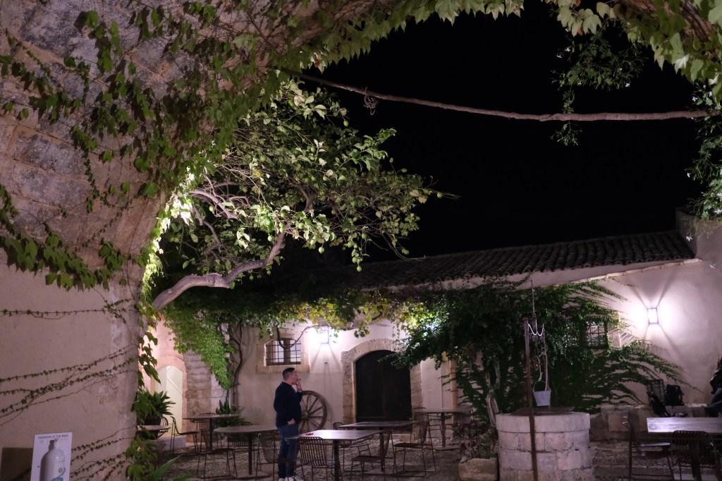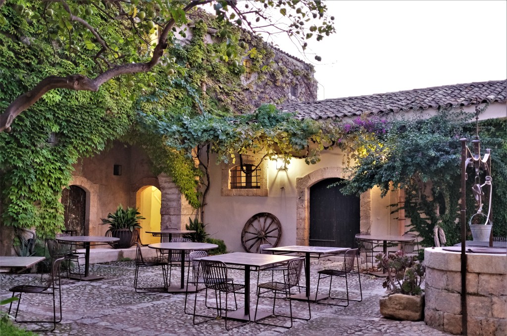 Sfidando il fresco ottobrino ho provato “l’ebbrezza” di una cena all’aperto nella poetica corte. Senza dubbi e remore inizio con un giro d’antipastini con sapori di Sicilia di “terra” una volta e deliziosi assaggi di “mare” un’altra, tris di arancini caldi, spaghetti con sarde e muddica, e via dicendo così per due sere fino al completo appagamento fisico e mentale. A seguire saranno notti di canto di cicale e di profumi, di silenzio e fiochi lumi.